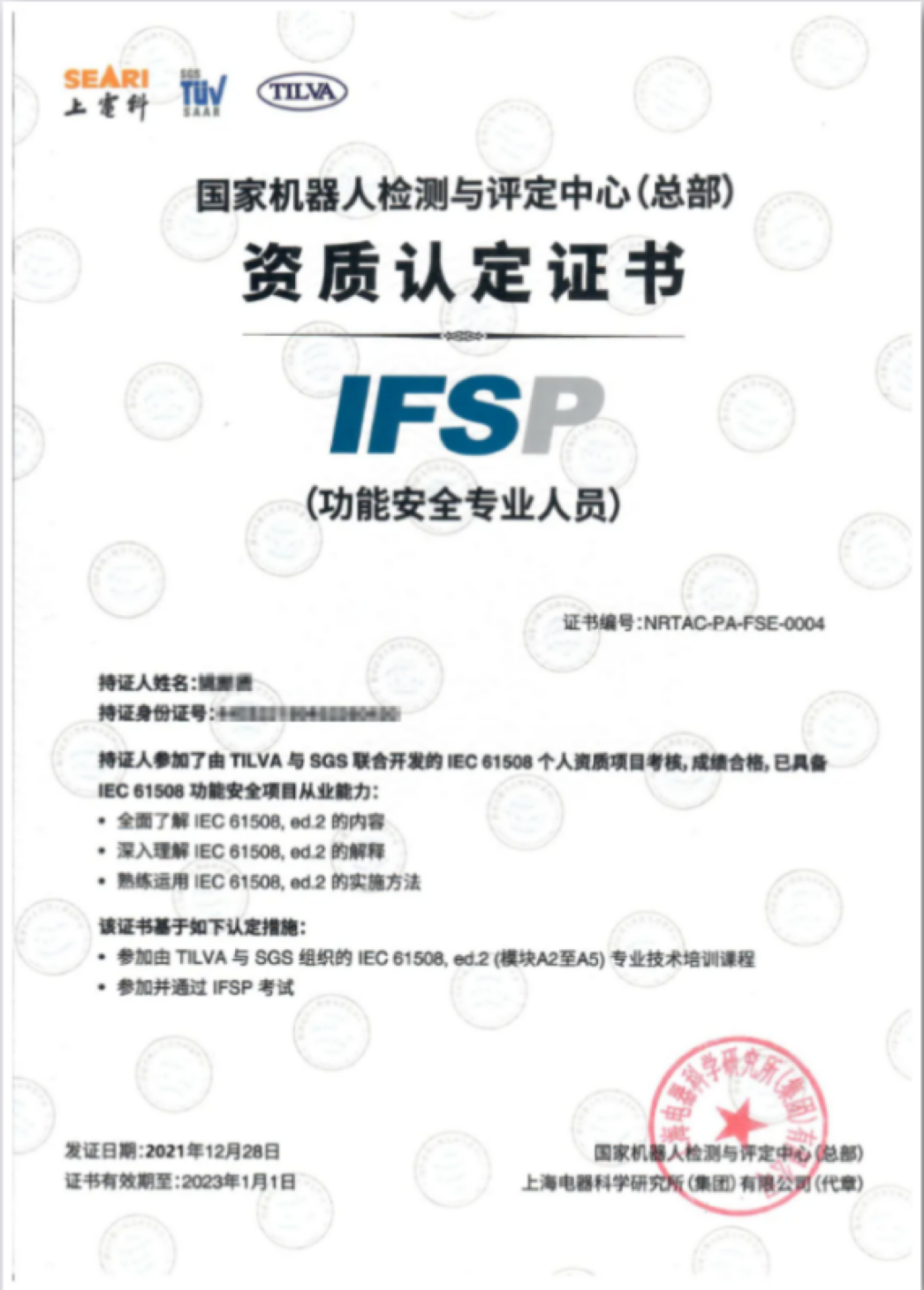• 顺利完成课程及考试后,可获得国家机器人检测与评定中心(总部)签发的IFSP功能安全证书和SGS-TüV Saar签发的IFSP功能安全证书。