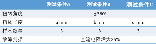 为了研究机器人电缆在2D扭转和弯折试验中主要应力和寿命的关系,以及相关的失效模式和失效机理。我们做了一系列加速寿命试验及失效分析,初步得到了主要应力的加速因子,以及弯扭试验下的失效信息。