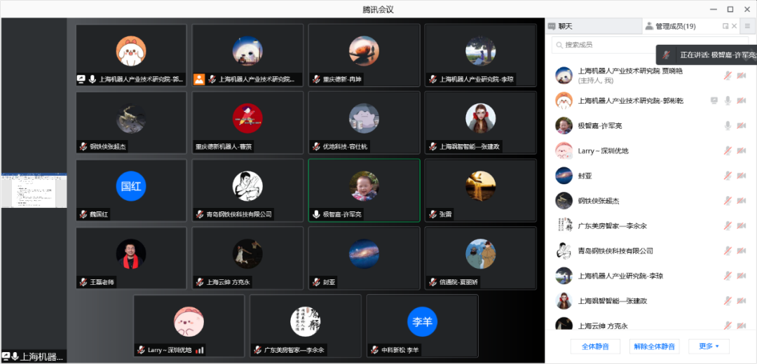 本次标准会议参会单位有:北京钢铁侠科技有限公司、青岛钢铁侠科技有限公司、上海飒智智能科技有限公司、广东美房智高机器人有限公司、大连瑞翔机电设备有限公司、上海云绅智能科技有限公司、深圳优地科技有限公司、北京极智嘉科技股份有限公司、中国信息通信东升国际、中科新松有限公司、北京京东乾石科技有限公司、塞伯睿机器人技术(长沙)有限公司、安徽宇锋智能科技有限公司、上海析冠信息科技有限公司、重庆德新机器人检测中心有限公司等。