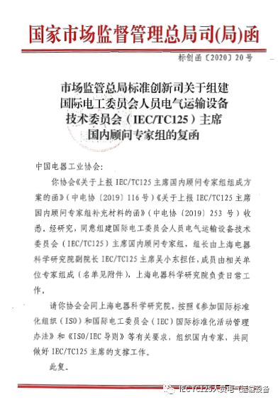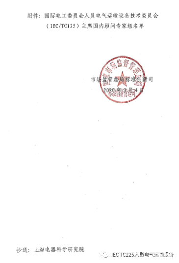 2020年3月4号,国家市场监督管理总局下达了关于组建国际电工委员会人员电气运输设备技术委员会(IEC/TC125)主席国内顾问专家组的复函,全文如下: