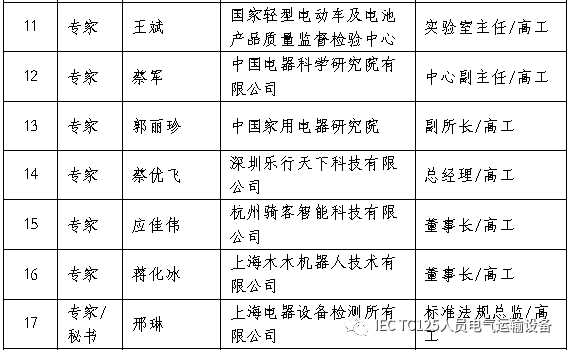 顾问专家组由对产业市场情况、产品技术、相关标准熟悉的技术专家组成,包括电气/机械安全、可靠性、功能安全、电磁兼容、维护、充电技术、关联TC等方面的专家。